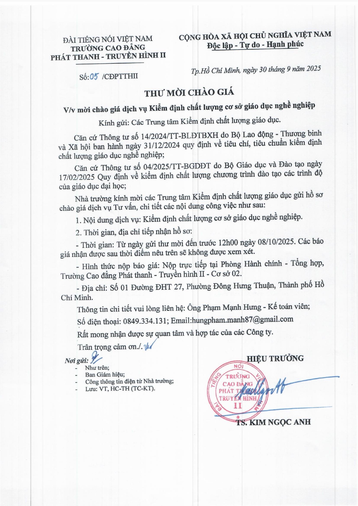 Thư mời chào giá về việc mời chào giá dich vụ Kiểm định chất lượng cơ sở giáo dục nghề nghiệp
